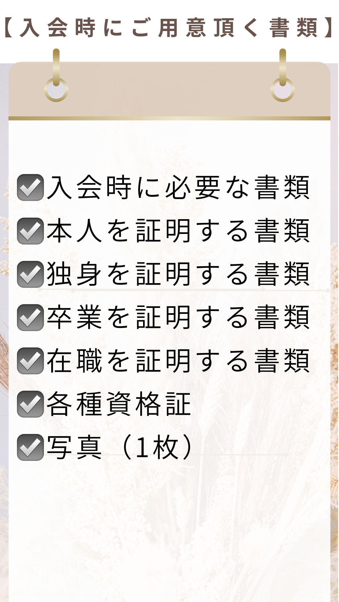 ご入会を決断いただきましたら、ご入会手続き・プロフィール作成を行います。必要書類(身分証明書・独身証明書等)をご用意いただき、プロフィール用の写真の撮影も行います。